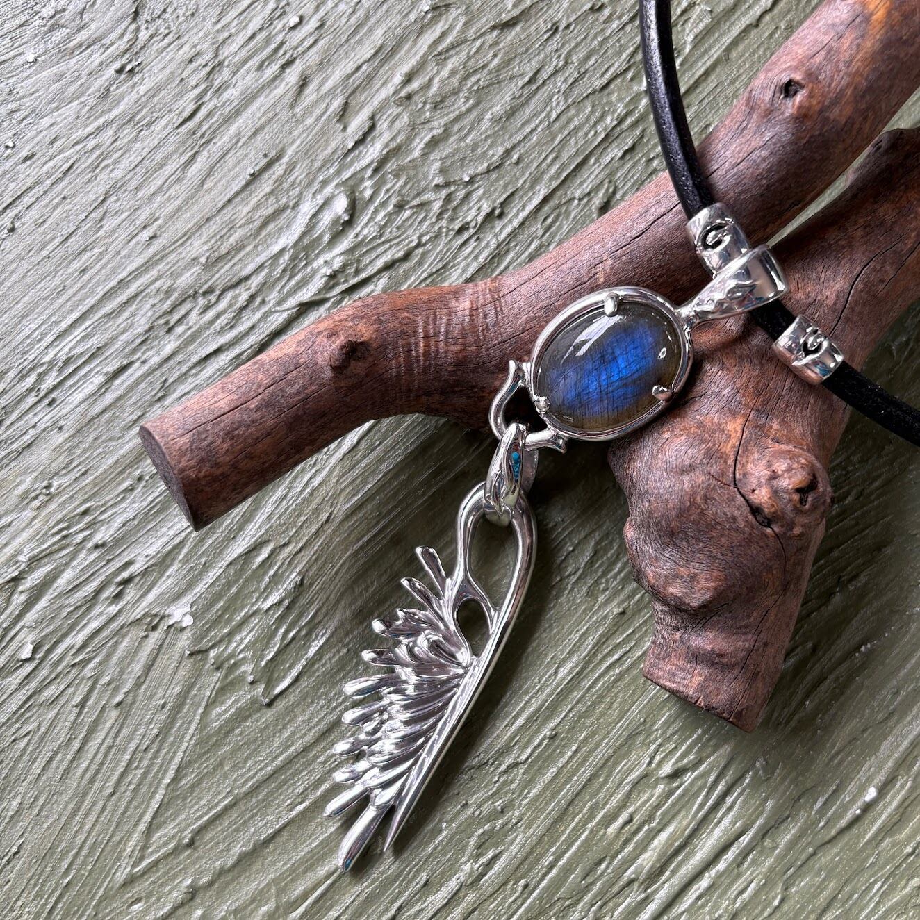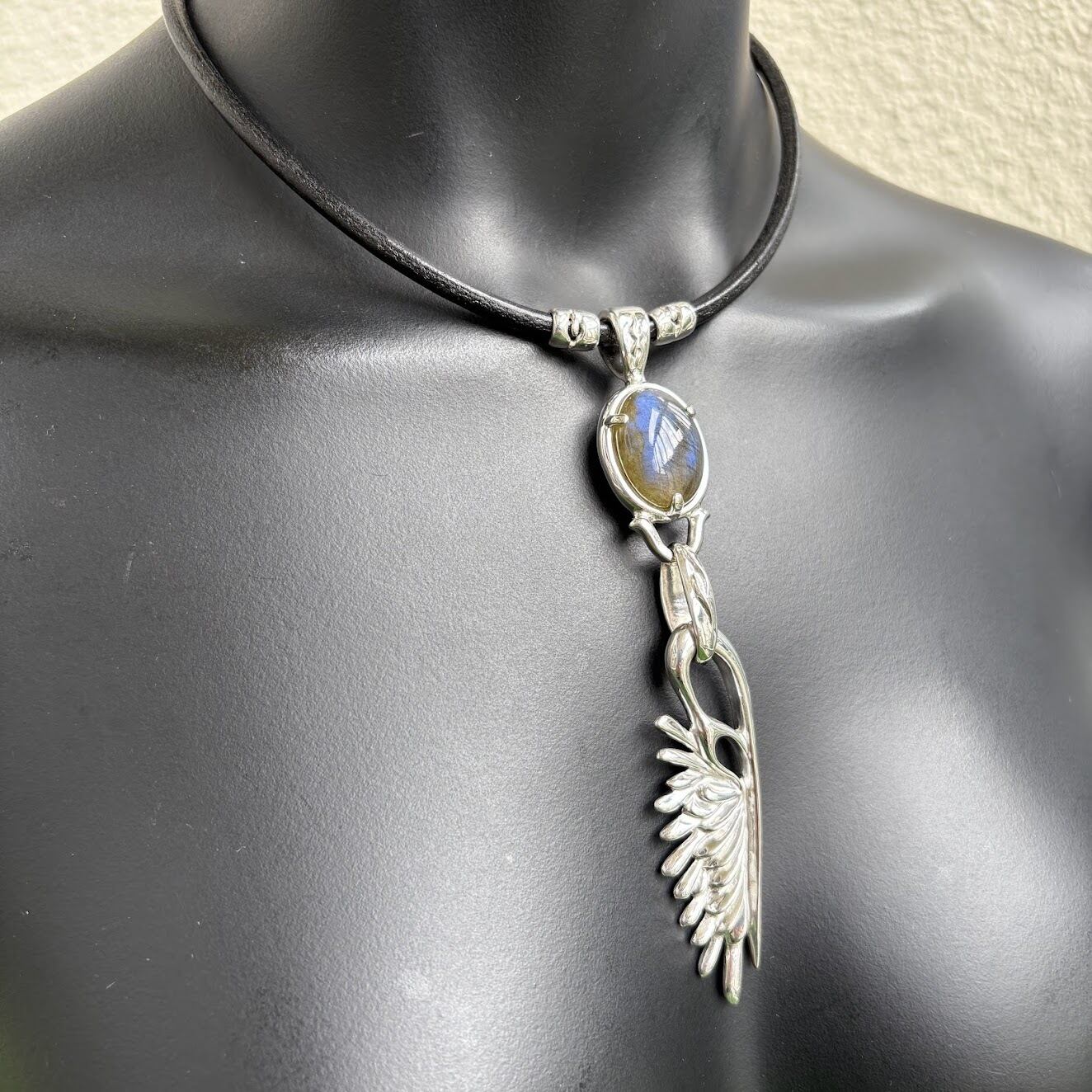 ラブラドライト&大ウイング・ペンダント(革紐仕様)