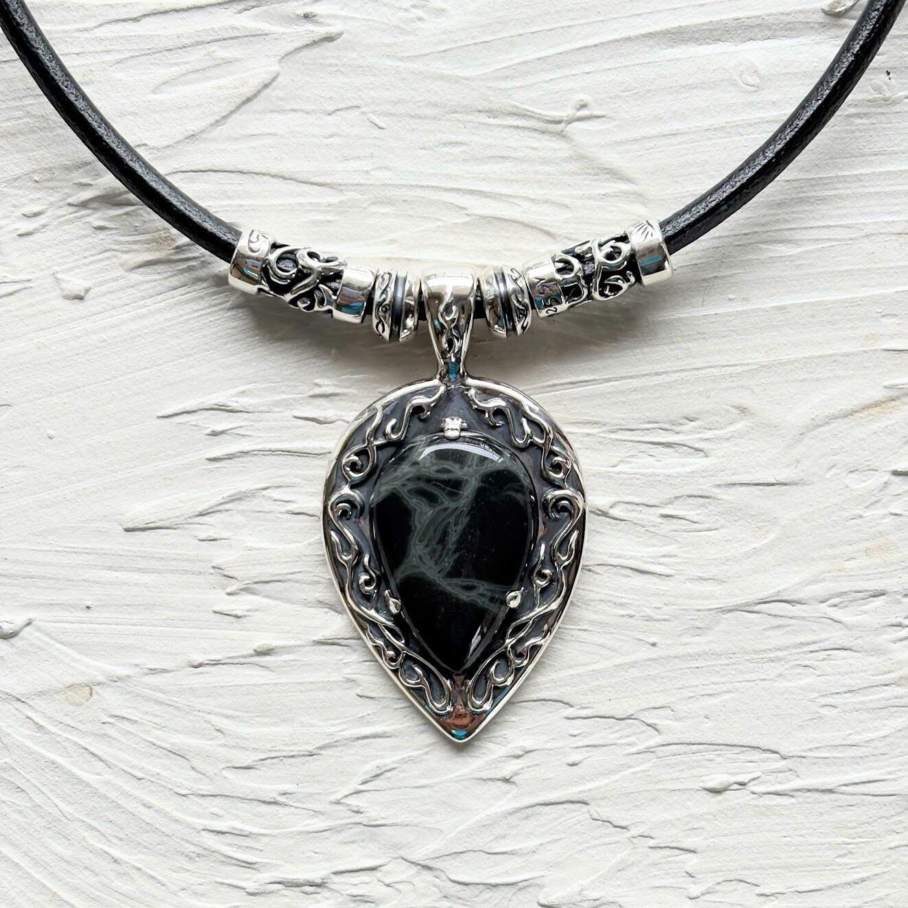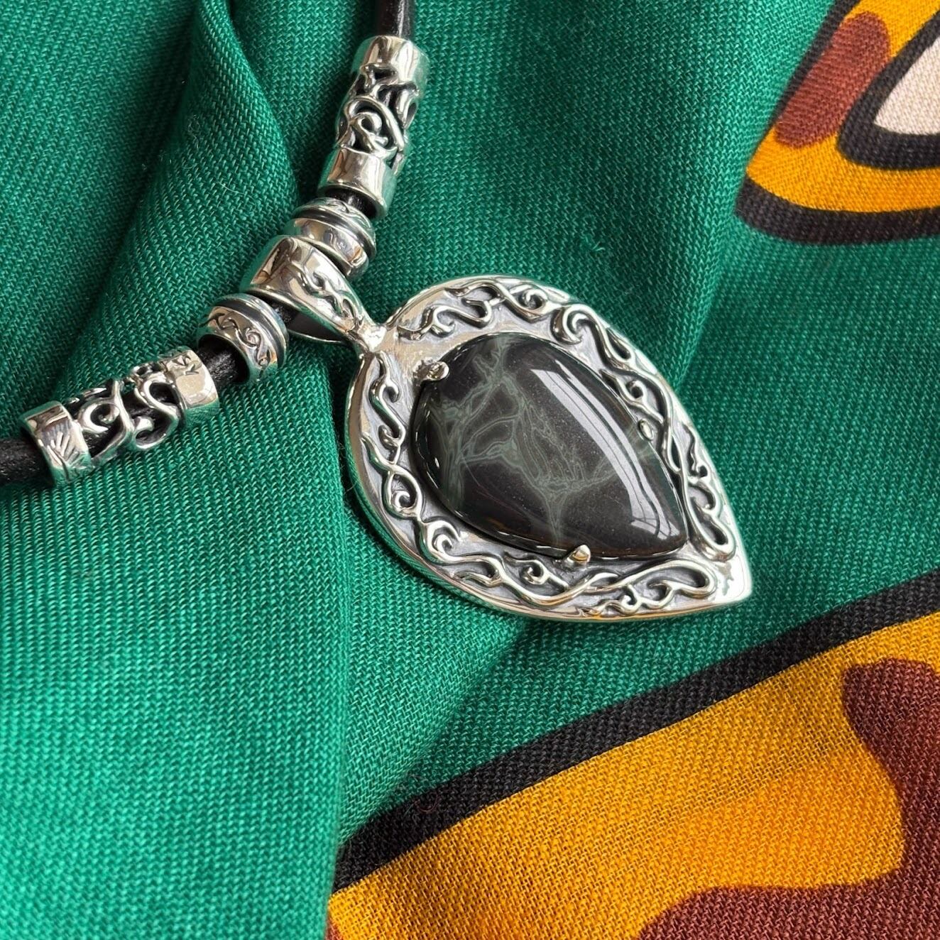 Spider Obsidian Pendant (with Beads and Leather Cord)