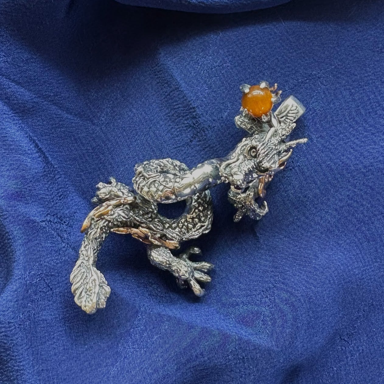 シルバーの龍にカッパー(銅)の炎。 五つ爪で掴んでいるのはペリドットです。