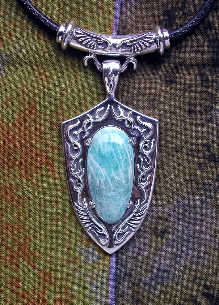 珍しいマダガスカル産のアマゾナイトをシールド型の枠にセット。