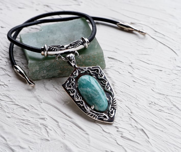 The rare Amazonite from Madagascar is set in a shield frame.