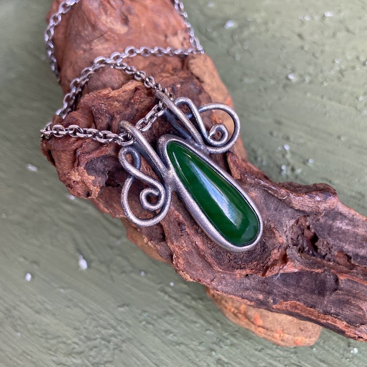 A one-of-a-kind pendant made with dark Nephrite with a smoked finish.